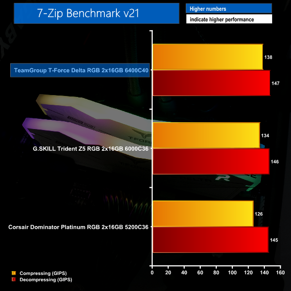 No complaints with the performance on display in 7-Zip, particularly in terms of compression performance, the high-frequency T-Force set does well versus G.SKILL’s tight 6GHz Trident Z5 RGB. Decompression performance is only marginally superior for this 6400MHz set though.