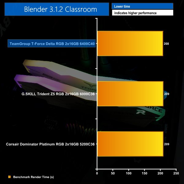 Basically, any of these kits will be fine for a Cinebench-style rendering workload. And Blender shows a similar trend, albeit with the TeamGroup set being technically quicker by a rather inconsequential margin.