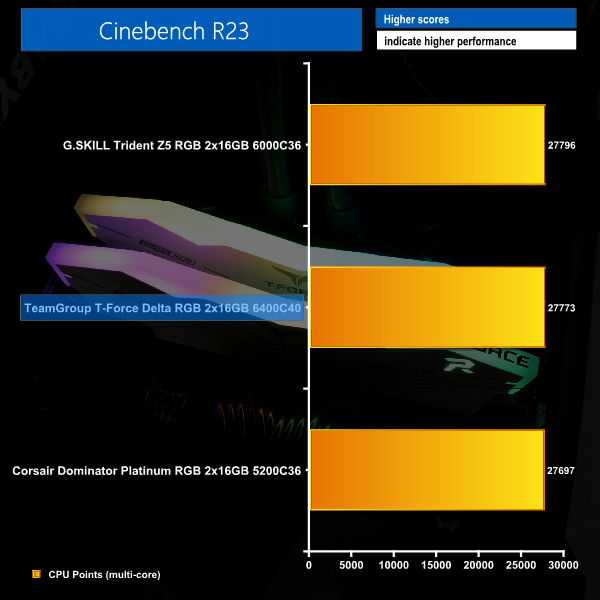Performance in Cinebench R23 nT is basically the same across the board. TeamGroup positions slightly behind G.SKILL, but the numbers are close enough to be considered a draw.