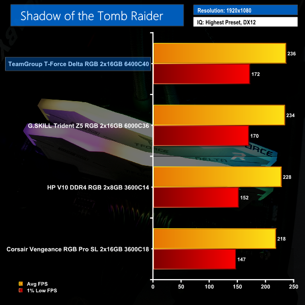 Switching up to Shadow of the Tomb Raider, though, sees the T-Force Delta RGB memory leverage its greater clock speed and sit at the top of our chart. We also see a reasonable gain versus alternative DDR4 memory kits, albeit with those sets being much cheaper to buy.
