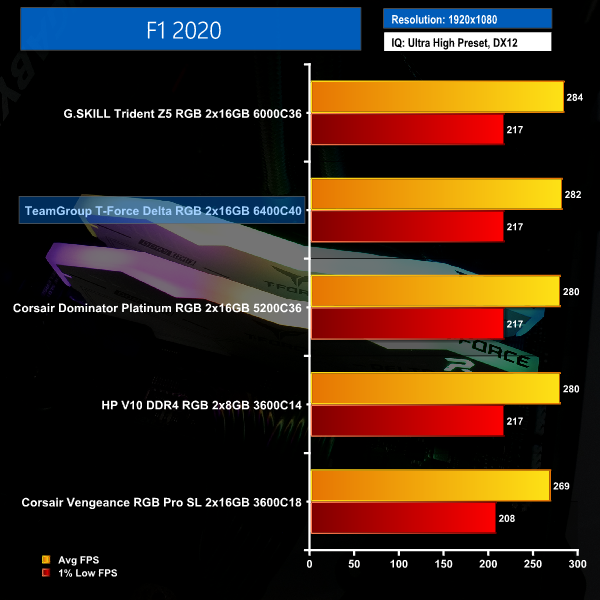 Running F1 2020 at 1080p, G.SKILL and its Samsung-based modules show the fastest frame rates on our test system. This 6400MHz SK Hynix-based set from TeamGroup is demoted to second place by a small average FPS margin.