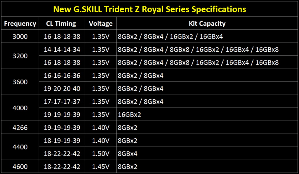 G.Skill's Trident Z Royal series consists of kits ranging from 3000MHz to 4600MHz in capacities ranging from 16GB to 128GB. You can see the exact frequencies, CL timings, voltage and kit capacities that will be available in the table above.