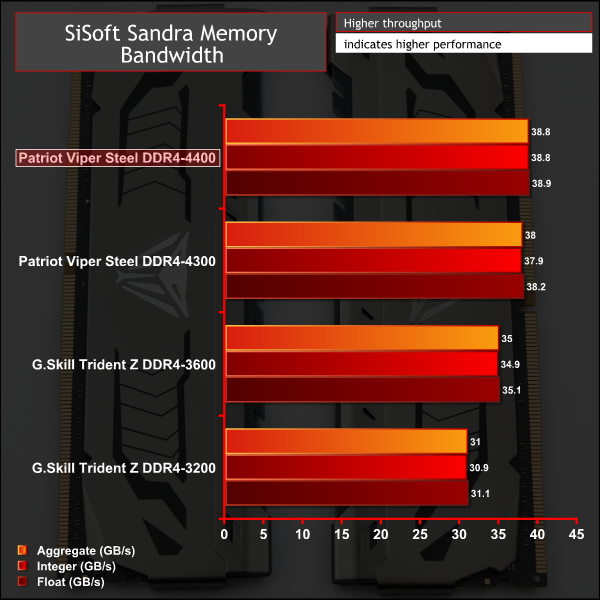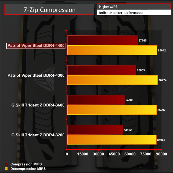 The 7Zip test scales well in terms of compression to the faster memory frequencies, the gap between 3600MHz and 4300/4400MHz is as large as you would expect.