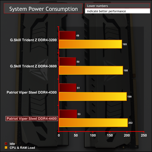 The combination of an increase in CPU voltages to aid stability, and the higher 1.45v for the DRAM, results in higher overall system power consumption. For stability we used the following voltage configurations when testing the Patriot Viper kit: