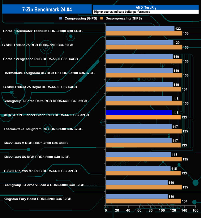 In the 7-Zip benchmark, the XPG Lancer Blade RGB sits in a mid position in the table but there isn't an awful lot in it between top spot and eleventh place on the table for either of the tests.