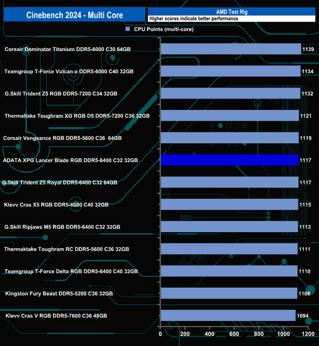 In the Cinebench 2024 multi-core test, the XPG Lancer Blade RGB 6400 sits in sixth place in the results table with the same score as G.Skill's Trident Z5 Royal 6400.