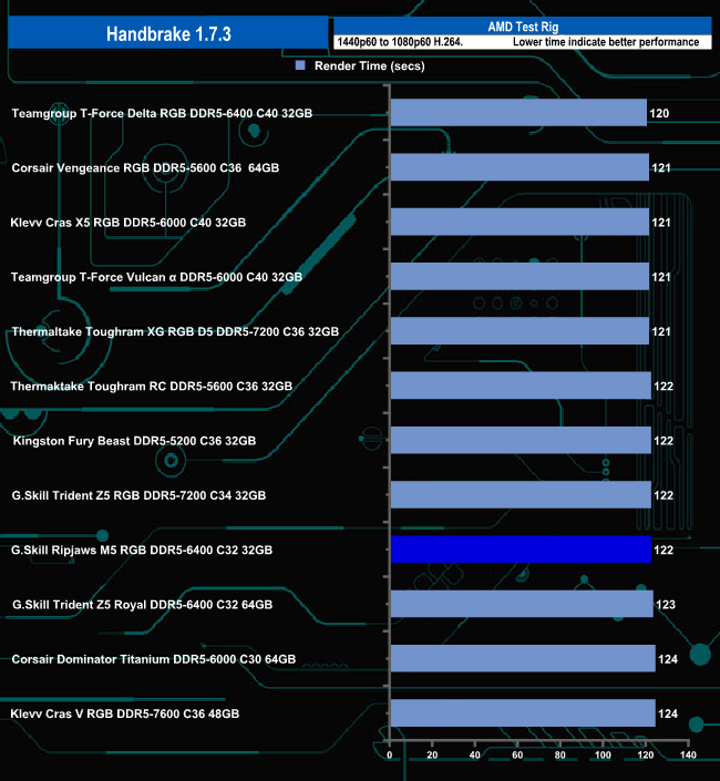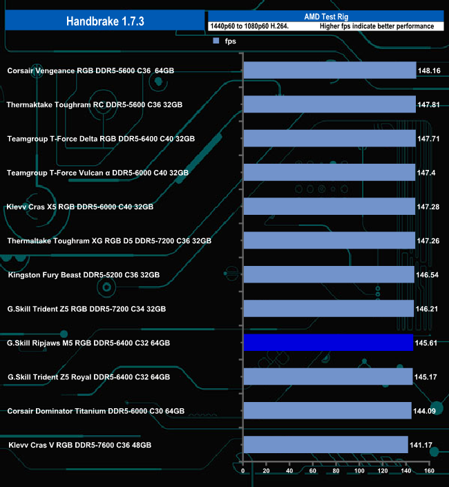 In the Handbrake test, G.Skill's Ripjaws M5 RGB 6400 sits near the bottom of the results chart but in reality, there is hardly anything in it between it and Corsair's Vengeance RGB DDR5-5600 that sits on the top of the table.