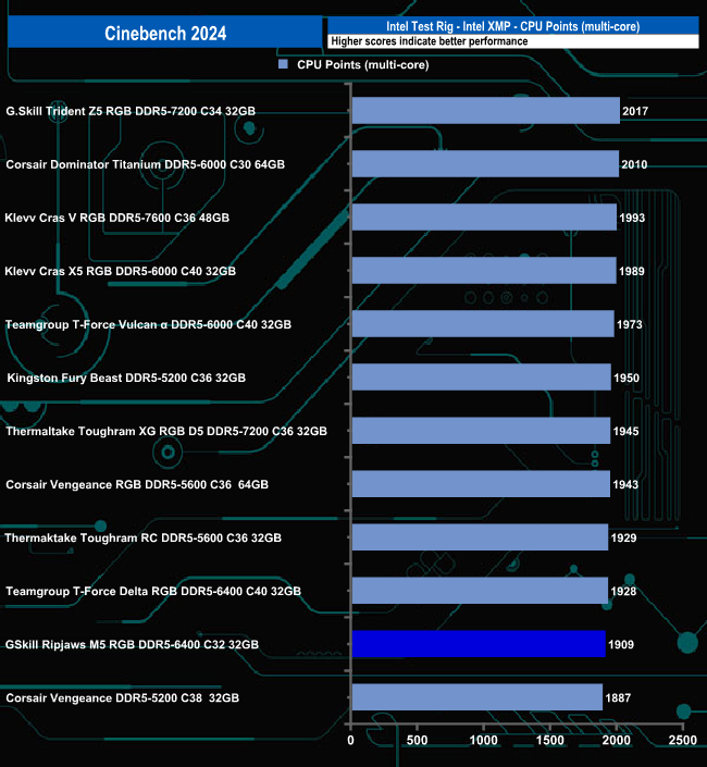 The G.Skill Ripjaws M5 RGB 6400 doesn't seem to handle the Cinebench 2024 multi-core test too well with only Corsair's Vengeance 5200 memory keeping it off the bottom spot on the results chart.
