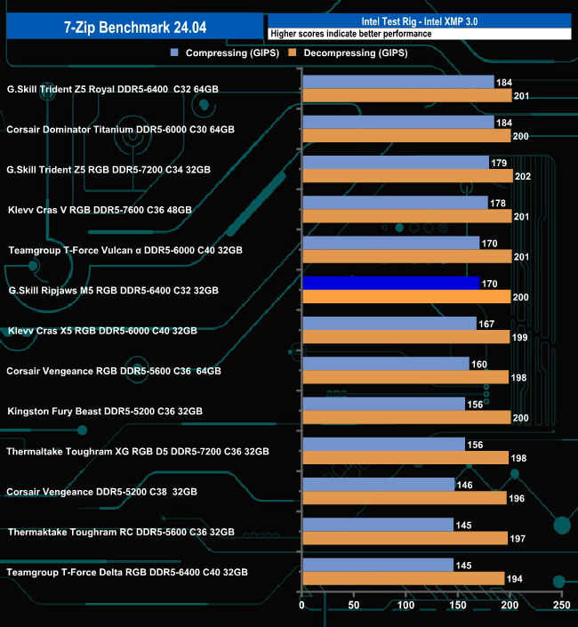 In the 7-Zip Compressing benchmark, the G.Skill Ripjaws M5 RGB is the slowest of the G.Skill modules we tested to date putting it in a mid-table position, but its Decompressing performance is better.