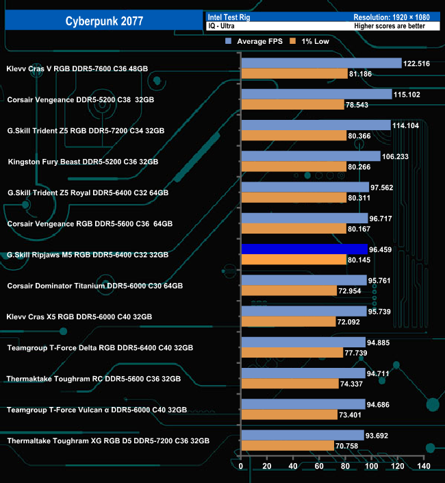 When tested with the Cyberpunk game benchmark using the Ultra settings, the drive produced test results of 96.459fps (average) and 80.145fps (1% Low) which puts the memory in the middle of the pack in the results chart. Switching over to the low setting saw the modules drop to last place on the table but in reality, there isn't much to choose between the bottom half of the results table.