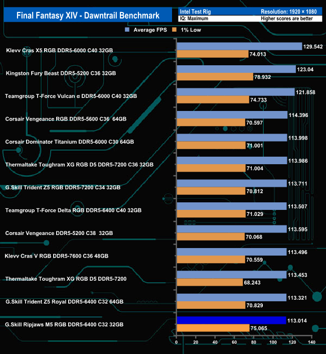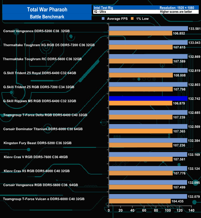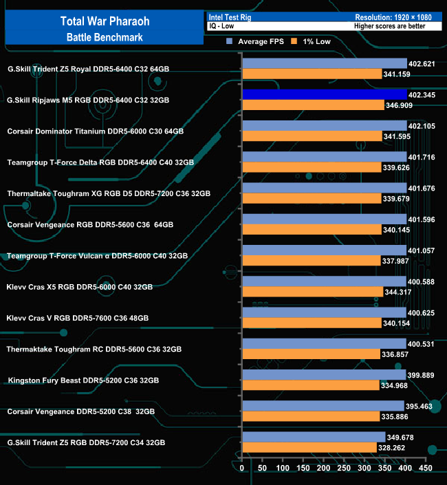 Using the Ultra quality settings the G.Skill Ripjaws M5 RGB 6400 memory sits in the middle of the results charts. Easing off the quality settings down to the Low setting sees the memory shooting up the chart to lie in second place behind the Trident Z5 Royal 6400 memory, also from G.Skill. Truth be told there isn't much separating any of the modules in these two tests.