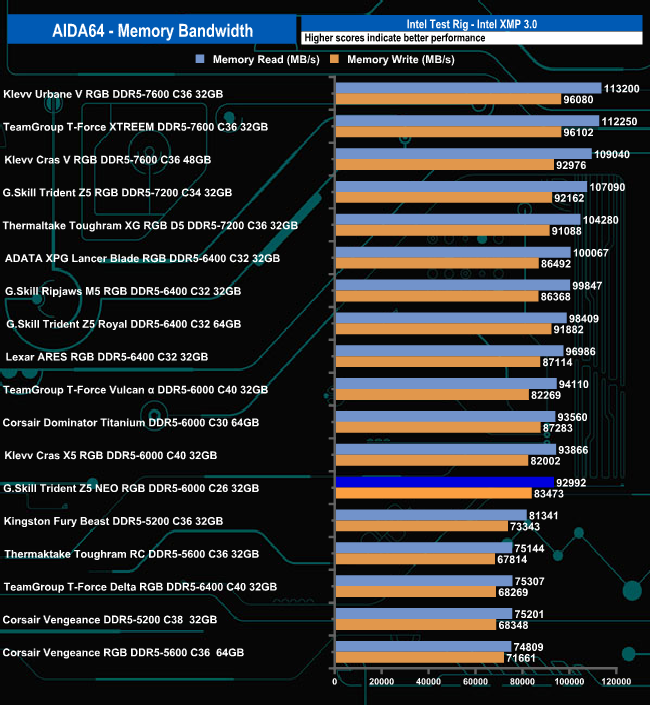 In the AIDA64 Memory Bandwidth test, the G.Skill's Trident Z5 NEO RGB read result of 92,992MB/s is the slowest of the G.Skill modules we tested to date and places the module in the bottom half of the result table.