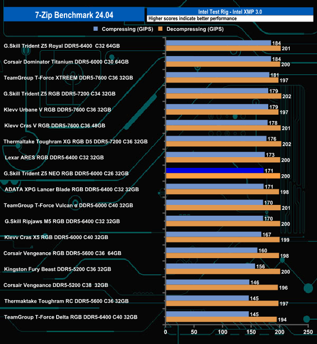 In the 7-Zip Compressing benchmark, the G.Skill Trident Z5 Neo RGB is the slowest of the G.Skill Trident Z5 modules we've tested to date, but good enough to put it in a mid-table position.
