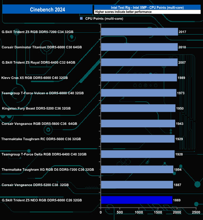 The G.Skill Trident Z5 Neo RGB DDR5-6000 doesn't seem to handle the Cinebench 2024 multi-core test too well, as it sits in last place in the results table.