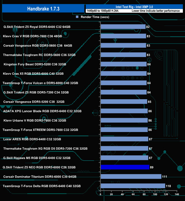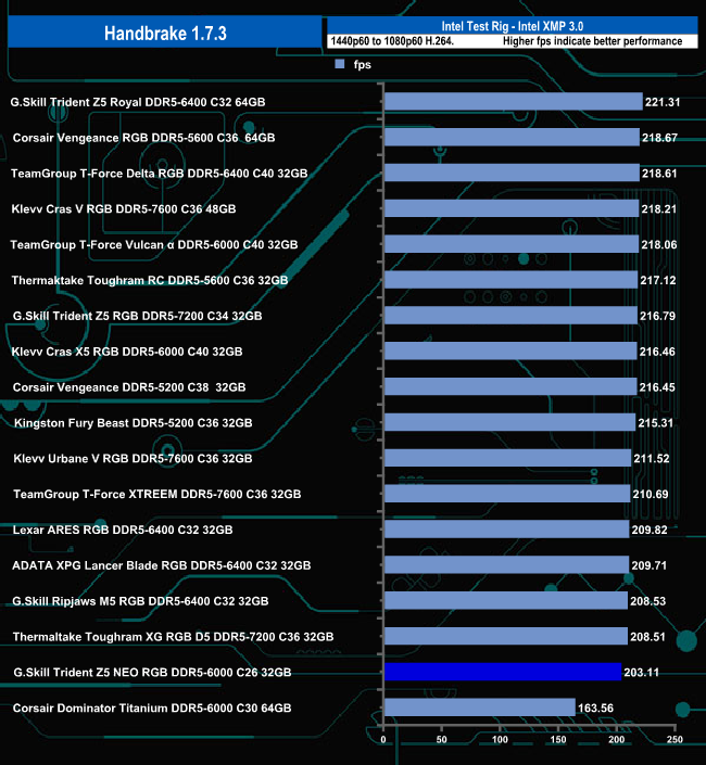 In the Handbrake test, the G.Skill Trident Z5 Neo RGB memory set sits in the penultimate spot in the results chart, 18.20fps behind the fastest modules we've seen to date, the Trident Z5 Royal 6400 C32, also from G.Skill.