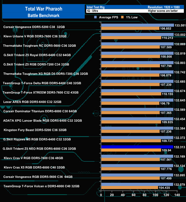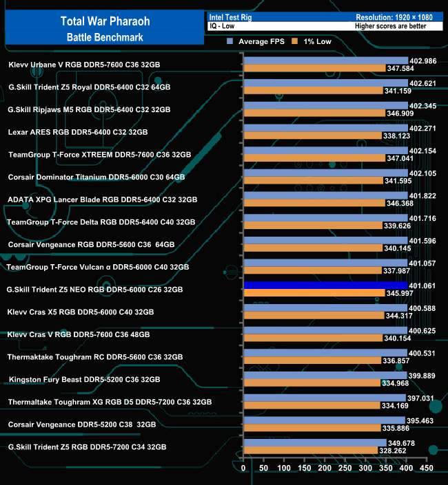 Using the Ultra quality settings, the G.Skill Trident Z5 Neo RGB 6000 memory sits in the bottom half of the results table. Easing off the quality settings down to the Low setting sees the memory moving up the table a few places.