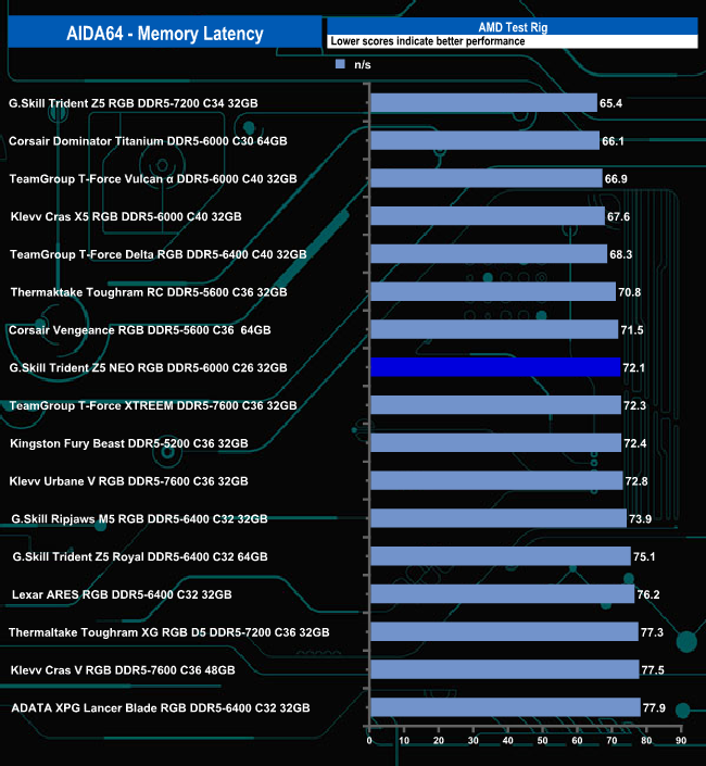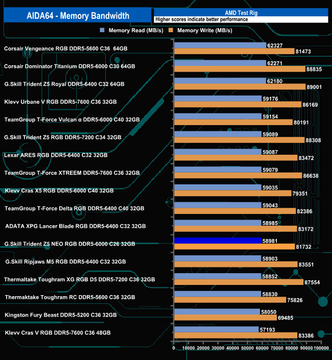 When tested with the AIDA64 memory benchmark, the 32GB kit of G.Skill's Trident Z5 Neo RGB DDR5-6000 C26 produced a read figure of 58,981MB/s a result which places the modules in the bottom half of the results chart.