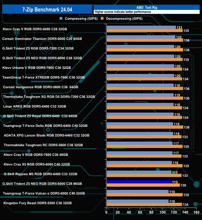 In the 7-Zip benchmark, the 96GB kit of G.Skill Trident Z5 Neo RGB 6000 C28 sits third from the bottom of the results chart. In reality, there isn't an awful lot in it between it and the Klevv Cras V RGB 6000 C28 in top spot.