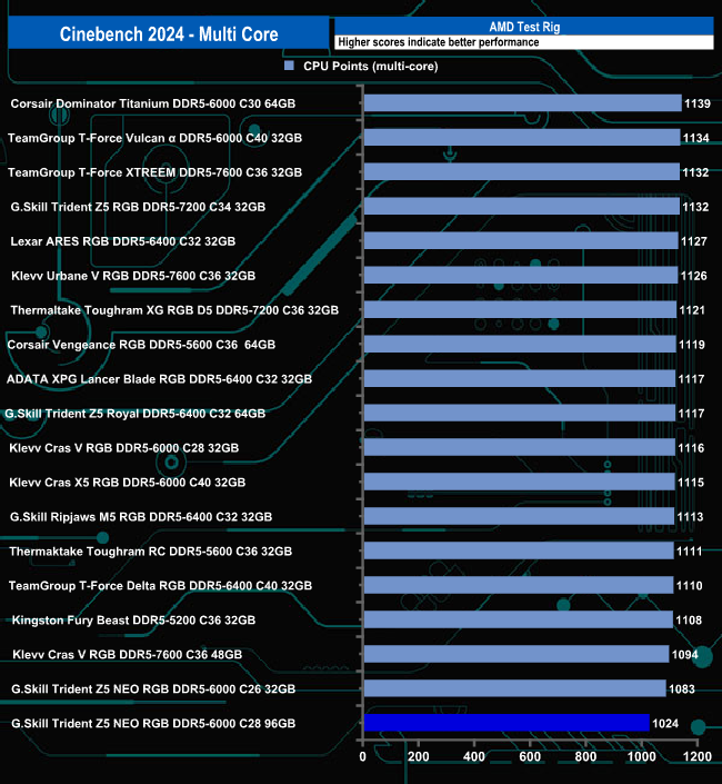 In the Cinebench 2024 multi-core test, the 96GB kit of G.Skill Trident Z5 Neo RGB 6000 C28 sits in last place in the results table.