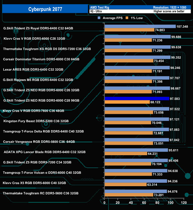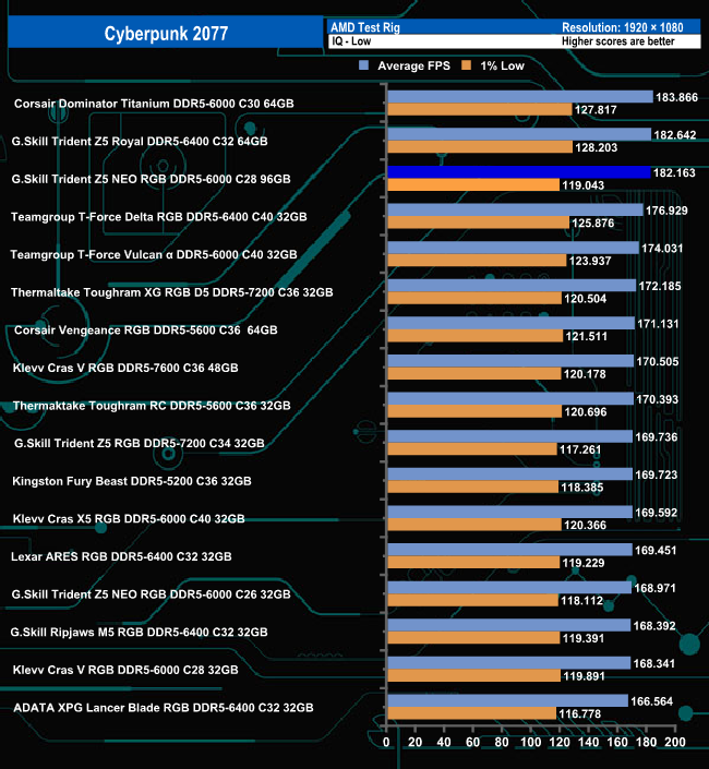 The Trident Z5 Neo RGB 6000 C28 performs well in Cyberpunk 2077 benchmark, sitting in eighth place using Ultra quality settings but moving up to third spot when the quality settings are dropped to Low.