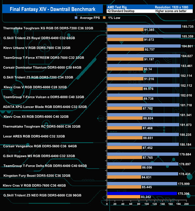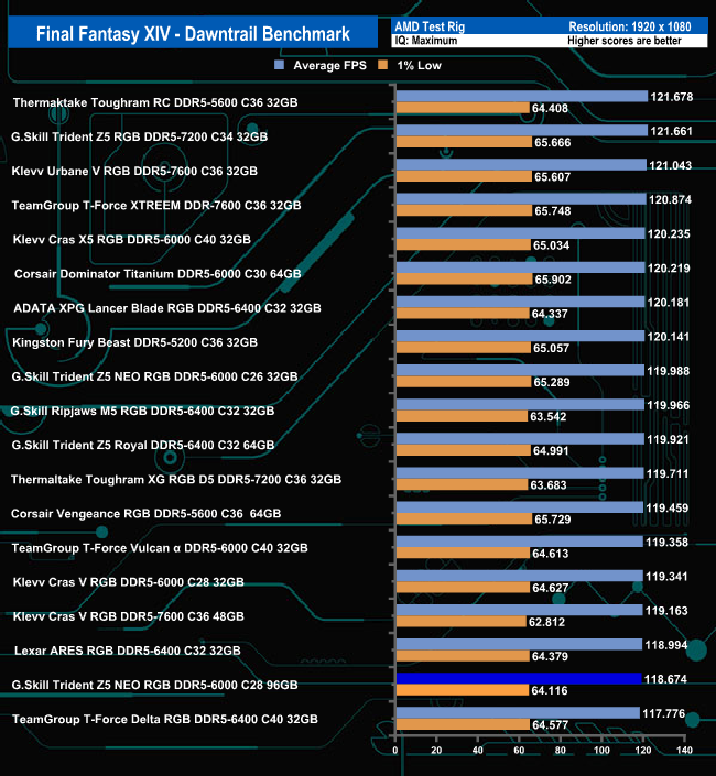 The 96GB kit of G.Skill's Trident Z5 Neo RGB 6000 C28 doesn't fare very well in the Final Fantasy XIV Dawntrail benchmark, sitting in the penultimate spot on the results chart using maximum quality settings and in last spot using the standard settings. Having said that, there's not much to choose from among all the kits in this benchmark.