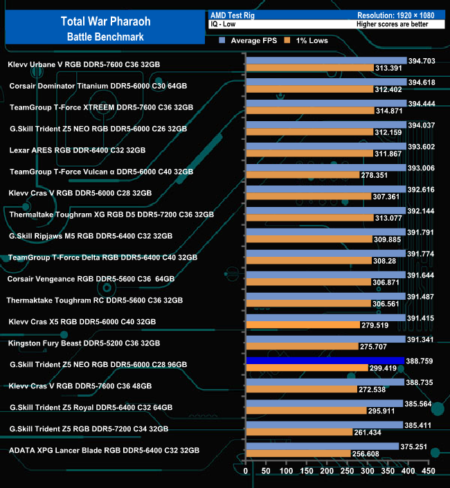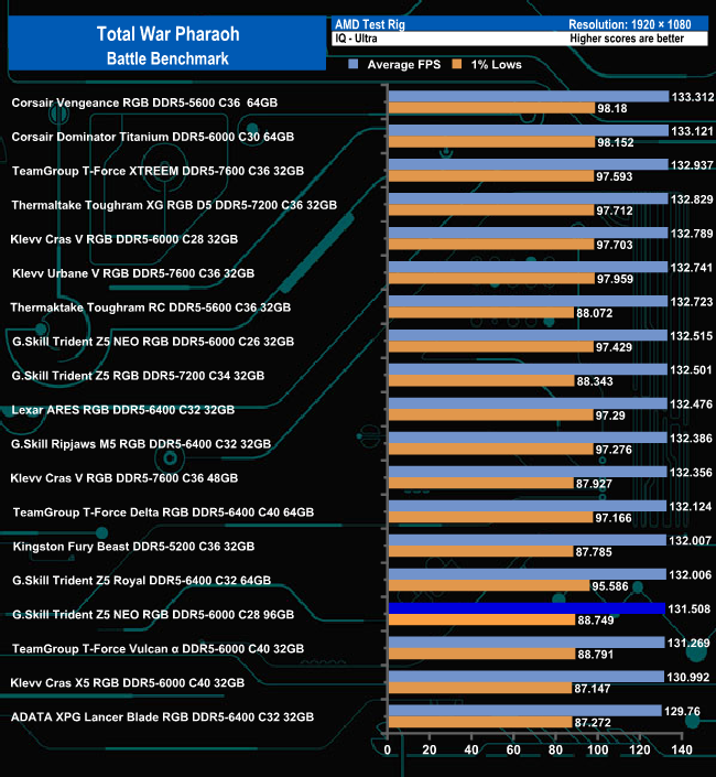 In the Total War: Pharaoh – Battle benchmark using Ultra quality settings, G.Skill's Trident Z5 Neo RGB 6000 96GB kit produces an average fps score of 131.508fps, which puts it in the fourth-from-bottom slot in the results table. Switching over to the low-quality settings sees the drive move up one place on the table.