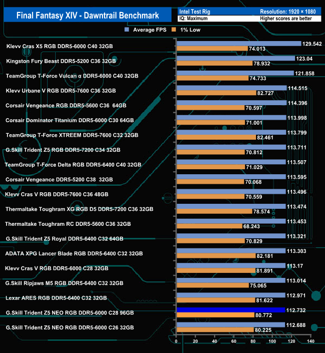 Using the maximum quality settings in the Final Fantasy XIV-Dawntrail benchmark, the memory sits in last but one place – but the margins are very slim. Reducing the quality settings to Standard Desktop results in an obvious increase in frame rate, but unfortunately, the modules remain in the same position in the table.