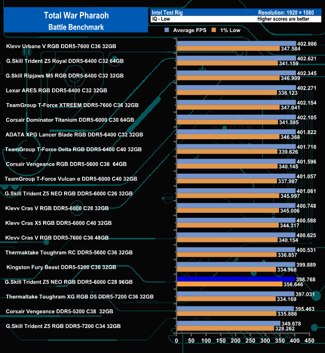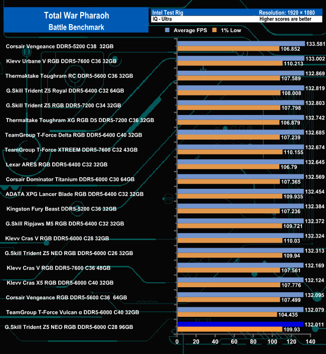 Using the Total War Pharaoh Battle benchmark with Ultra settings, the 96GB Trident Z5 Neo RGB 6000 kit sits in last place on the results table. But in truth, there is only a 1.57fps difference (average fps) between the G.Skill kit and the Corsair Vengeance DDR5-5200 C38 kit in first place, while its 1% low performance is better than most.