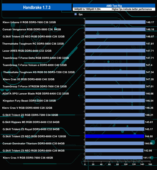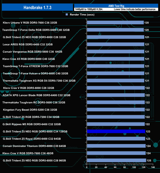 In the Handbrake test, the Trident Z5 Neo RGB DDR5-6000 C34 128GB kit sits near the bottom of the results chart, but in reality, there is hardly anything in it between it and Klevv's Urbane V RGB DDR5-7600 C36 kit that sits at the top of the table.