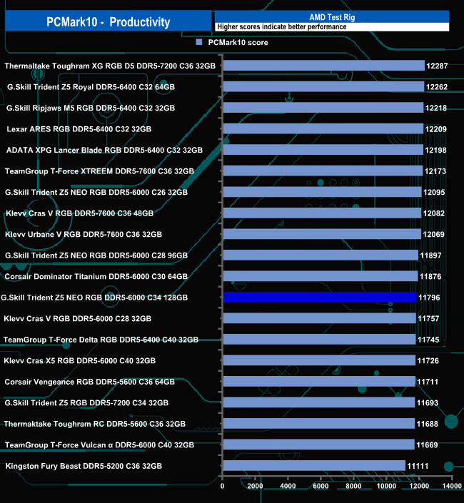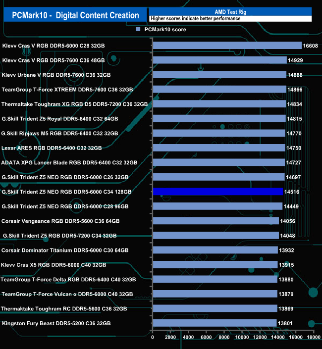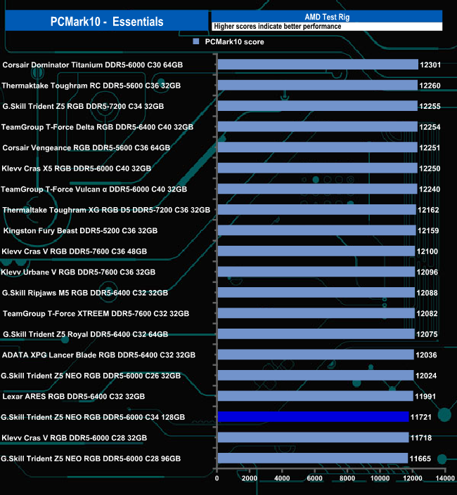 When tested with PCMark10, G.Skill's Trident Z5 Neo RGB DDR5-6000 C34 produced a mix of results. Compared to other kits in the list, it performs best using the Productivity traces, and then Digital Content Creation. The worst performance came from the Essentials test.