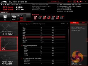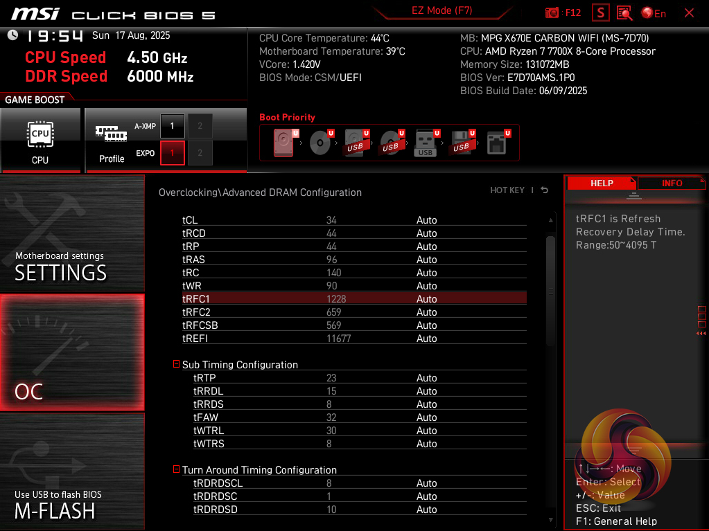 The memory runs at DDR5-5600 with timings of 46-45-45-90-135 (1.10V) natively with the single EXPO and Intel XMP profiles supporting DDR5-6000 with 34-44-44-96-140 timings at 1.35V.