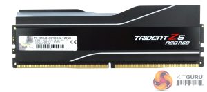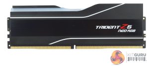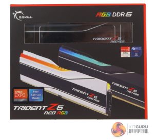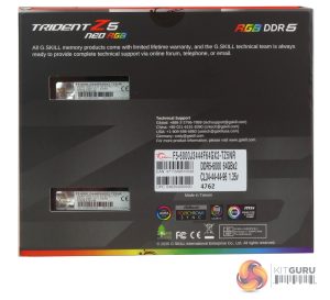 The front of the box that the memory comes in has a cut-out near the top, allowing you to see part of one of the modules. Below this are two award logos, and below these are two illustrations of what the memory looks like. The bottom left of the box is home to the AMD EXPO sticker along with the Trident Z5 Neo RGB branding.