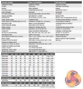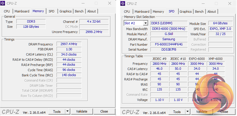 The heat spreaders on the modules are made from aluminium finished in (in the case of the review sample) matte black with a black brushed-aluminium insert (a matte white finish is also available). The spreaders give the module a height of 42.8mm. The modules are a dual-rank design; under each heatsink, there are sixteen 4GB Samsung chips (K4RBH086VM-BCWM – M-die according to the Thaiphoon Burner utility) along with a Richtek RTQ5132GQWF power management IC (PMIC).