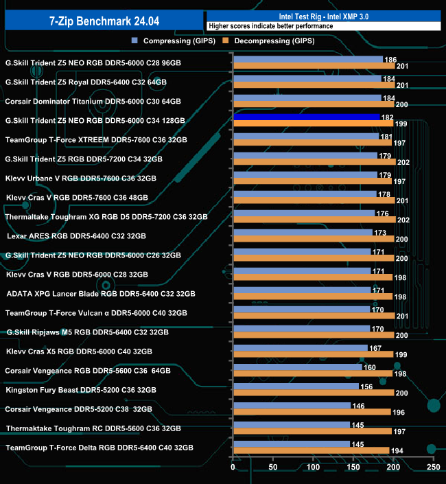 In the 7-Zip Compressing benchmark, the 128GB kit of G.Skill's Trident Z5 Neo RGB DDR5-6000 C34 memory sits in fourth place in the results chart with a Compressing score of 182 GIPS, although there is not much to separate the top five in this table.