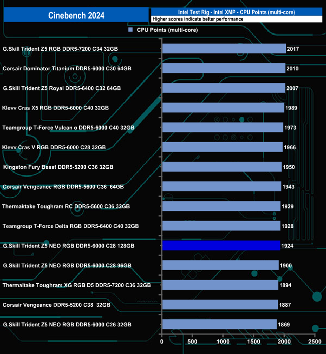 The 128GB kit's Cinebench 2024 CPU points score of 1924 sees it in the lower half of the results chart.