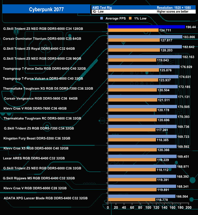 Easing off the quality settings to the Low setting sees the memory move up a spot on the list. It's 1% Low score is the seventh best we've seen in this test.