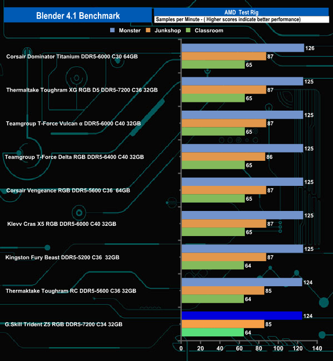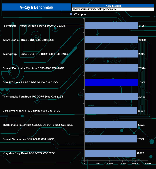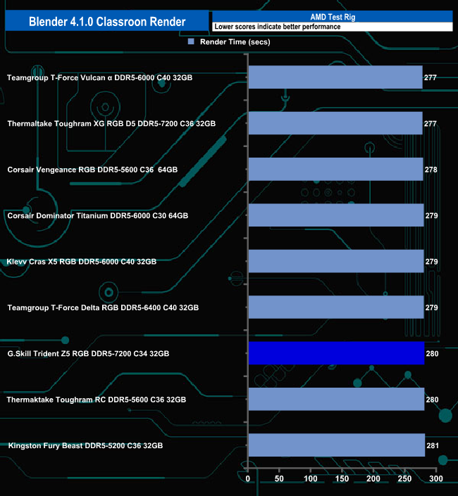 Once again there is hardly anything to choose between memory kits in the render test. Just four seconds separated the top kit, Teamgroup's T-Force Vulcan α 6000, from the Kingston Fury Beast 5200 sitting at the foot of the table.