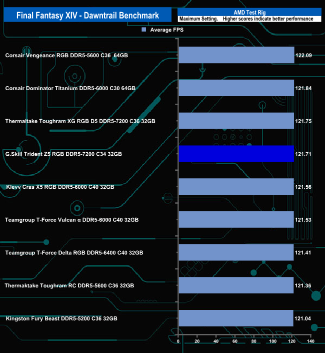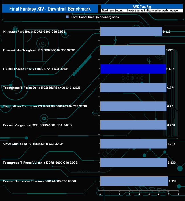 There's not much to choose from between all the kits in the Final Fantasy XIV Dawntrail benchmark regarding fps, but there are more variations in scene load times with the G.Skill Trident Z5 RGB 7200 sitting in third place behind the lead kit, KIngston's Fury Beast 5200.