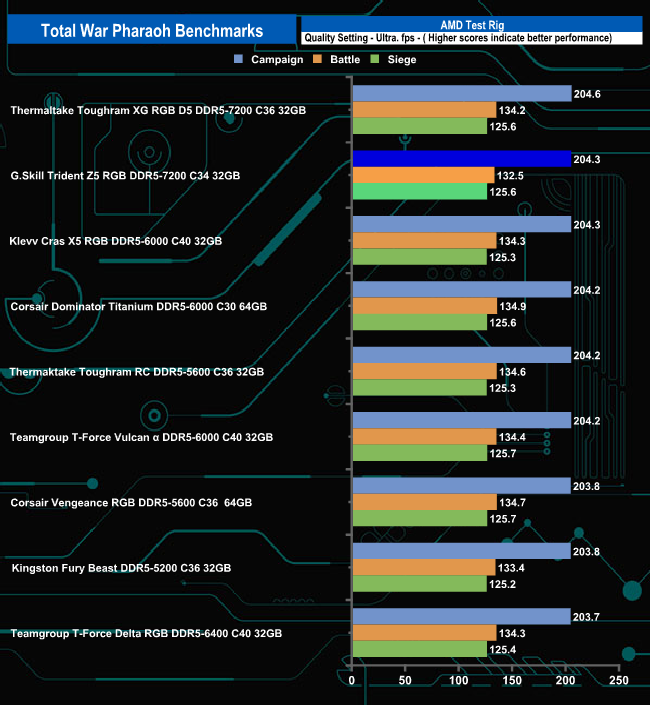 As with the Final Fantasy XIV Dawntrail benchmark, there is no marked difference between any of the modules regarding the three Total War Pharaoh built-in benchmarks.