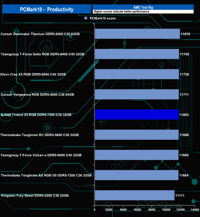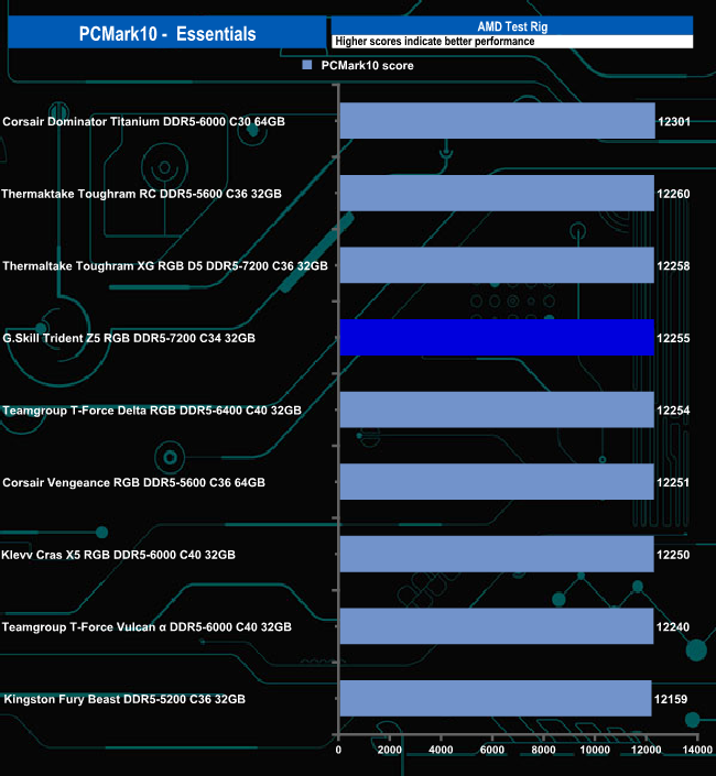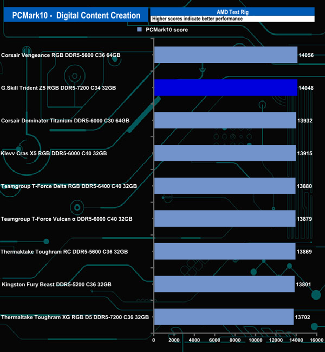G.Skill's Trident Z5 RGB 7200 memory displays pretty consistent performance in all three parts of the PCMark 10 benchmark although it seems to perform better in the Digital Content Creation tests.