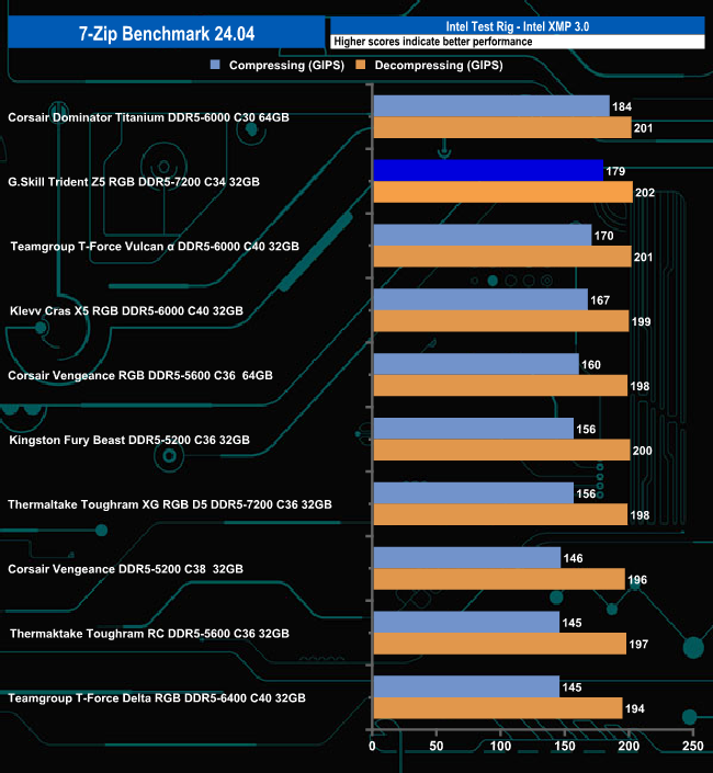 In the 7-Zip Compressing benchmark, the Trident Z5 RGB 7200 sits in second place behind Corsair's Dominator Titanium 6000. But it does have a very small and we mean very small advantage over the Corsair memory in the Decompressing test.