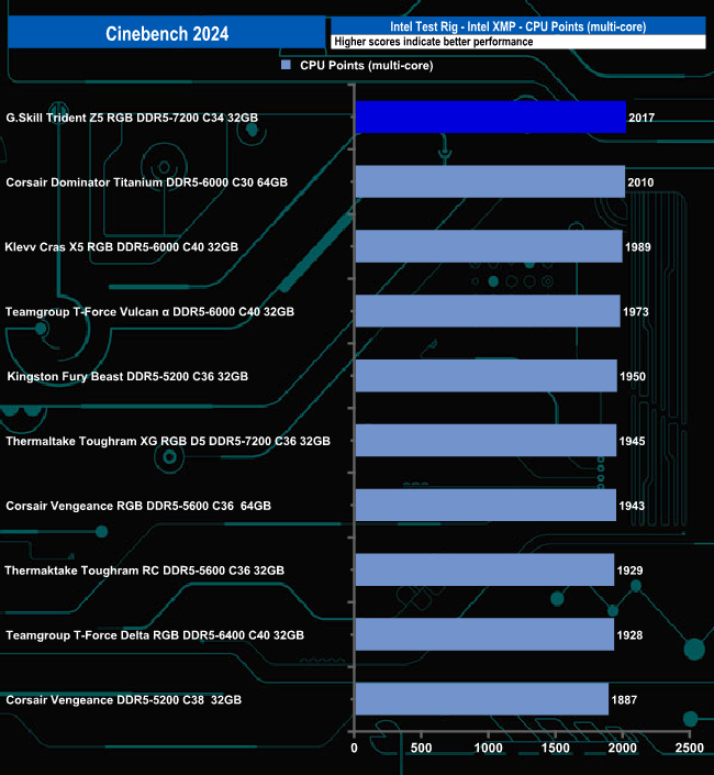 The G.Skill modules sit in the top spot albeit not by very much in the Cinebench 2024 multicore test.
