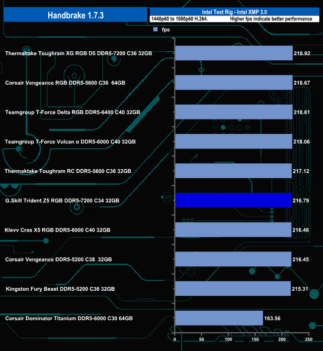 In the Handbrake test, the G.Skill memory set sits in a mid-table position but truth be told there's hardly anything in it between the first and ninth place on the results chart.