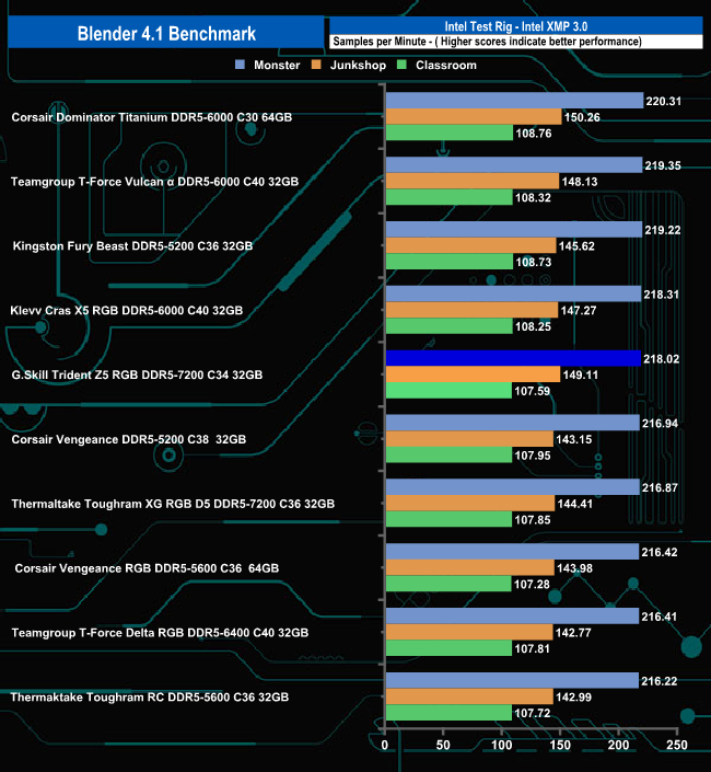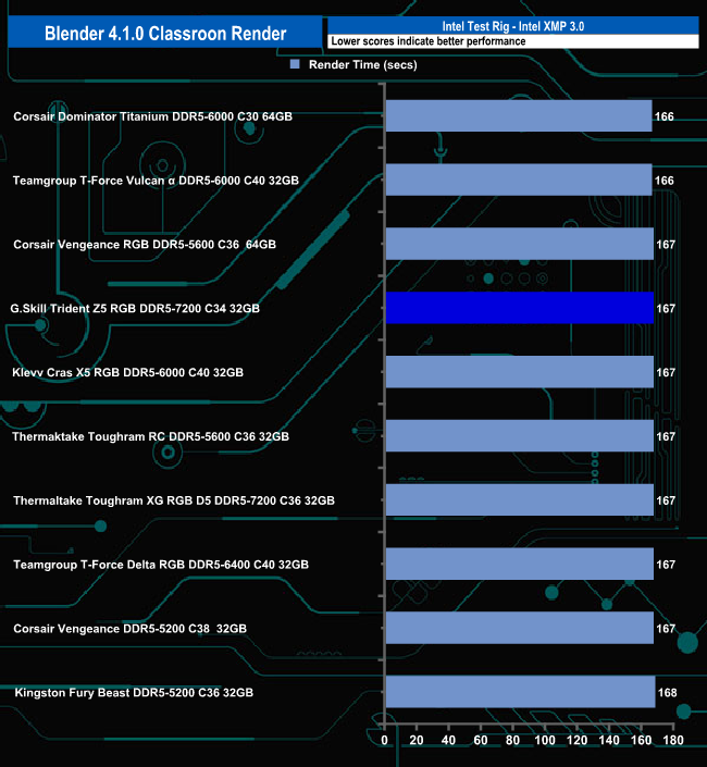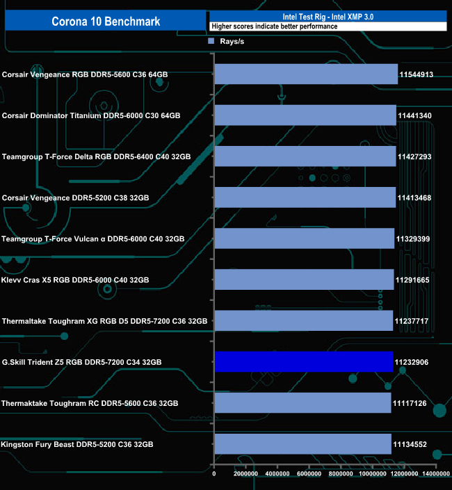 The Corona 10 benchmark test result sees the G.Skill Trident Z5 RGB 7200 set, right down in the bottom half of the results chart, just behind the only other DDR5-7200 set tested to date in this list, Thermaltake's Toughram XG RGB D5 C36.