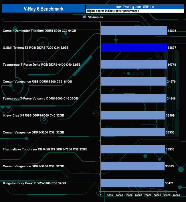 In the V-Ray 6 benchmark test, the G.Skill Trident Z5 RGB pair of modules did enough to place second on the results chart although there isn't a lot in it between first place (Corsair Dominator Titanium 6000) and the G-Skill modules.