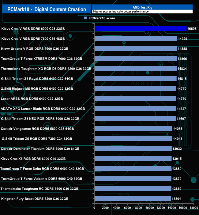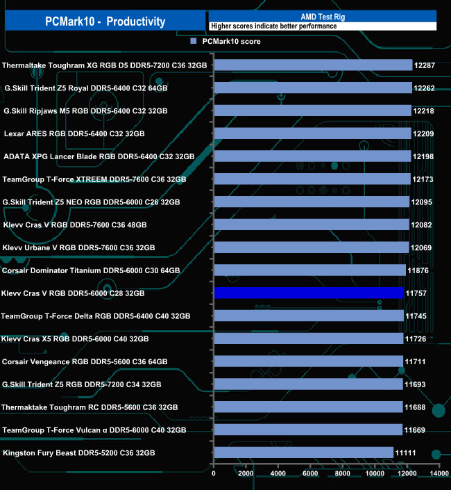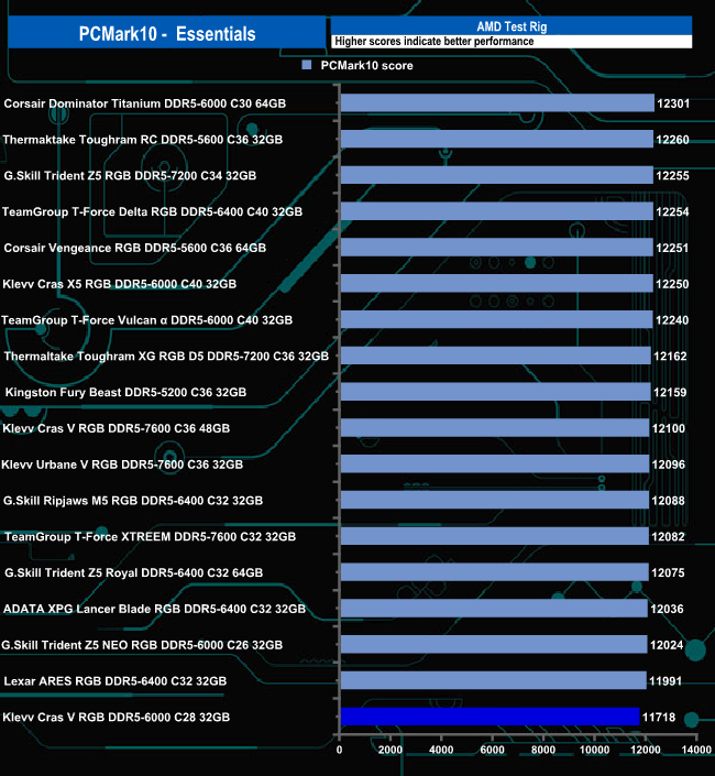 The Klevv Cras V RGB CL28 memory delivers a mixed bag of results in the PCMark 10 benchmark. It's the slowest of the tested modules in the Essentials test, sits halfway in the Productivity test and is the fastest by some way using the Digital Content Creation traces.