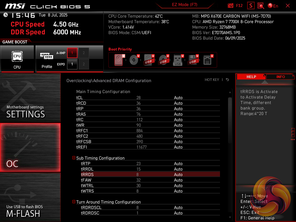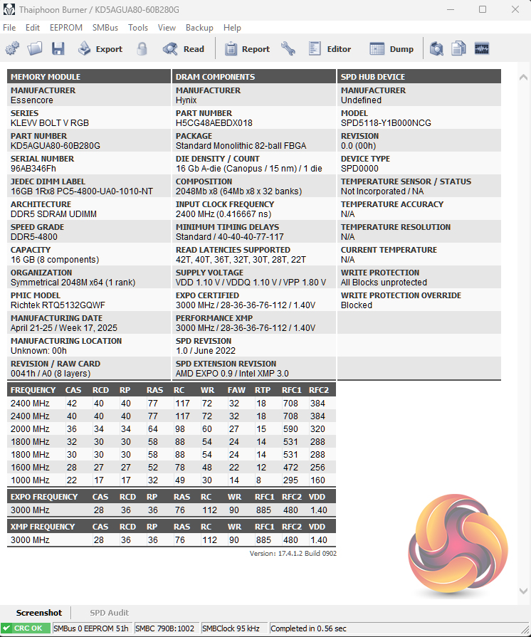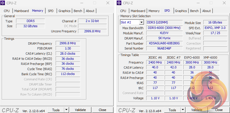 The memory runs at DDR5-4800 with timings of 40-40-40-77-117 natively with the XMP 3.0 and EXPO profiles supporting DDR5-6000 with 28-36-36-76-112 timings at 1.4V.