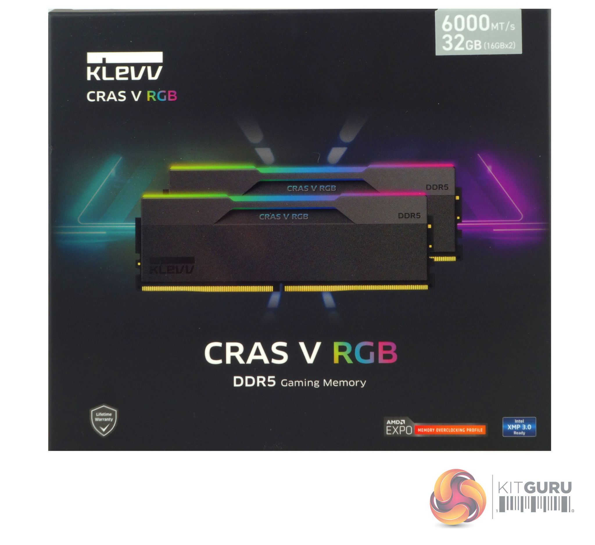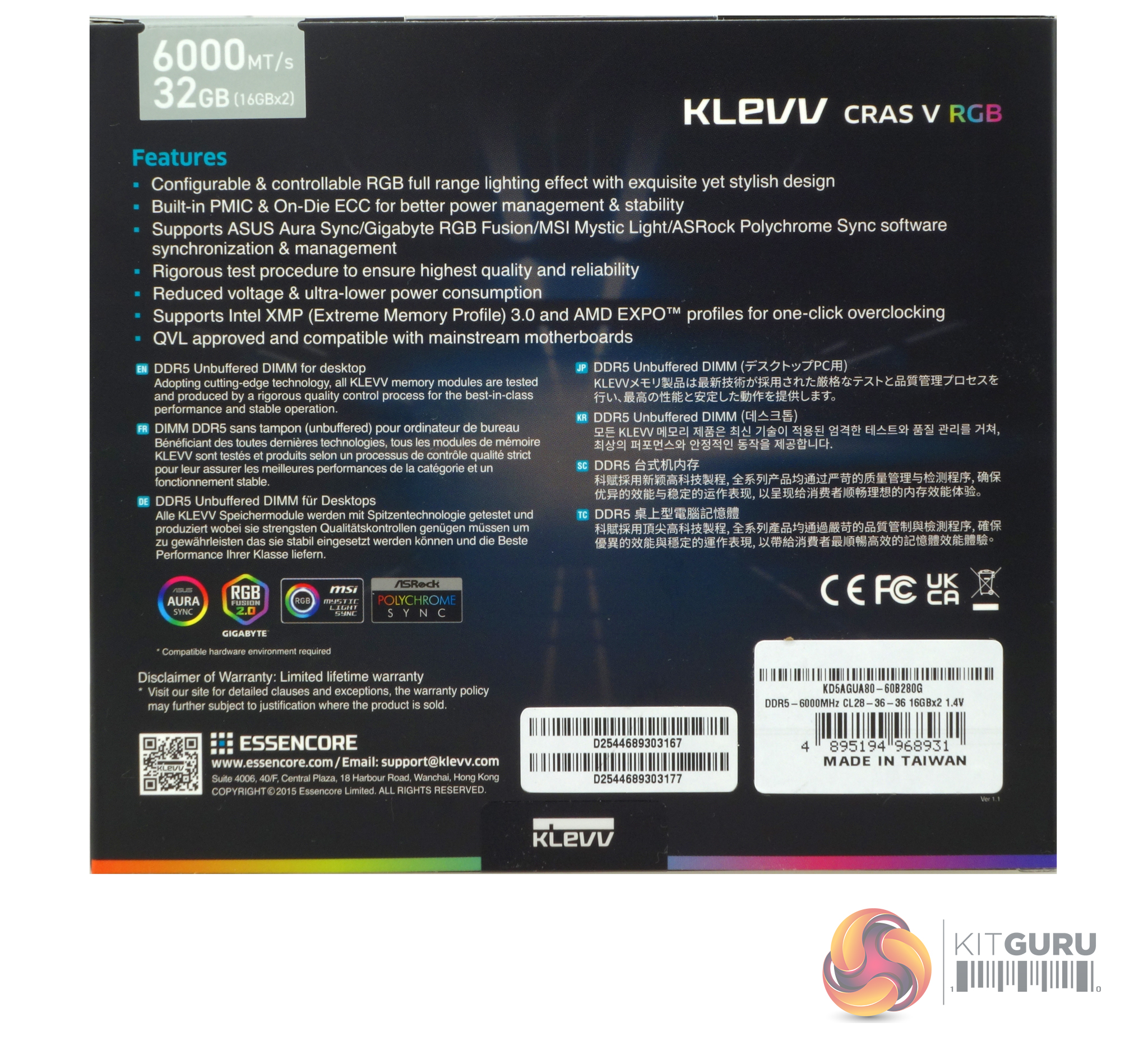 The front of the box has a good, clear image of what the memory modules look like. At the top right of the box is a sticker displaying the memory speed and the kit capacity (in this case, 6000MT/s and 32GB). The bottom left of the box has an icon displaying that the memory comes with a lifetime warranty, while the bottom right has the icons for Intel XMP and AMD EXPO support. At the top of the rear of the box is the other end of the speed and capacity sticker. Below this is a small feature list, multilingual information about the modules and icons displaying the motherboard RGB systems supported: Asus Aura Sync, Gigabyte RGB Fusion 2.0, MSI Mystic Light Sync, and ASRock Polychrome Sync.