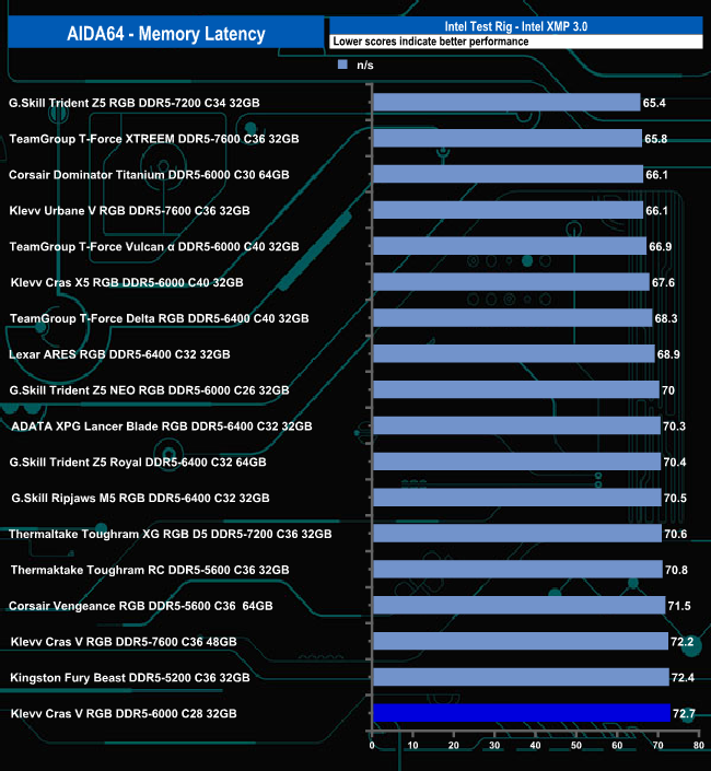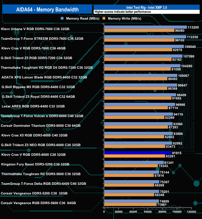 In the AIDA64 Memory Bandwidth test, Klevv's C28 Cras V RGB DDR5-6000 has the slowest read/write scores of the Cras modules we've tested to date.