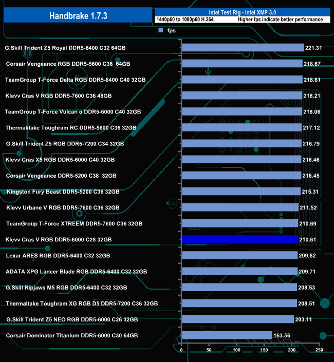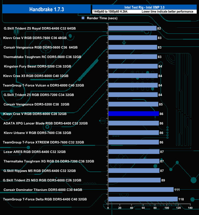 In the Handbrake test, the Klevv Cras V RGB C28 memory set sits in the lower half of the results chart but truth be told there's hardly anything in it between the it, sitting in thirteenth place, and the G.Skill module in the top spot.
